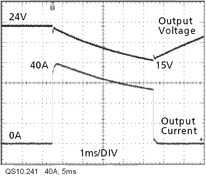 Bildet viser en 10 A strømforsyning som gir ut 40 A i 5 ms.