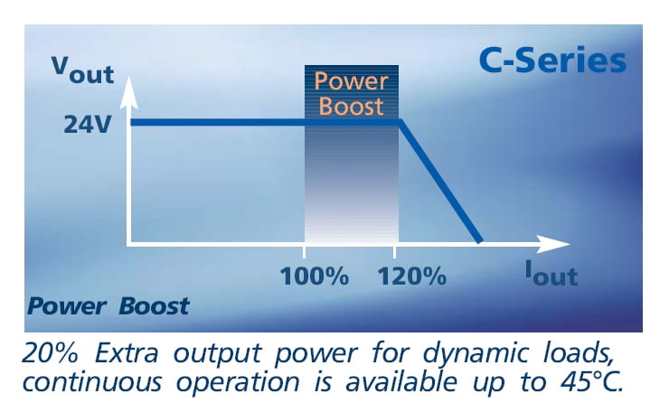 C-serien har samme høye kvalitet og driftssikkerhet som Q men med færre tekniske funksjoner. C-serien er standard valget.Puls strømforsyninger har ekstra strøm tilgjengelig for å håndtere oppstart av for eksempel DC-motorer eller midlertidige høye strømuttak i applikasjonen. Funksjonen betyr at man ikke trenger å overdimensjonere strømforsyningen for å håndtere høye strømuttak. Vi bruker to forskjellige begreper; Bonuseffekt og effektreserve. Nedenfor er en kort beskrivelse av forskjellen og hvilke enheter som har hvilken funksjon
