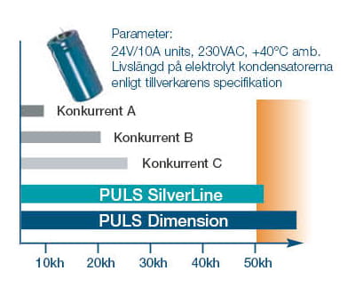 Elektrolytt kondensatorene er den komponent som er mest følsom for varme og som i prinsipp avgjør levetiden på strømforsyningen. For hver 10° C økning av temperaturen halveres levetiden. Høy kvalitet på kondensatorene sammen med høy virkningsgrad er en forutsetning for en bra strømforsyning. Alle Puls strømforsyninger oppfyller disse kriteriene.
