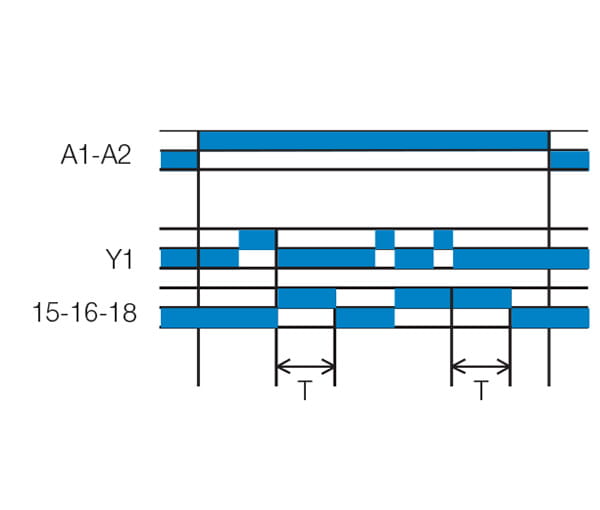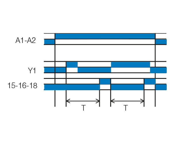 Når driftsspenningen A1-A2 tilkobles starter tidtakingen. Releet begynner med pause og bytter fra 15-16 til 15-18, og går deretter tilbake til 15-16. Prosessen gjentas så lenge driftsspenningen A1-A2 er tilkoblet. Innstilt tid T er den samme for både pause og gangtid.