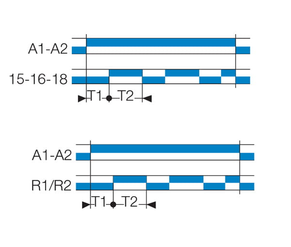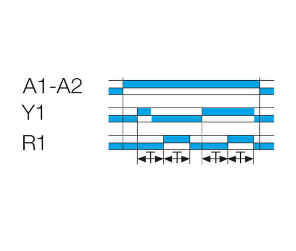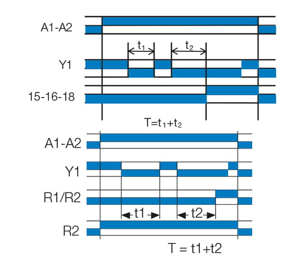 Når driftsspenningen A1-A2 tilkobles, starter den første tidtakingen T1. Etter innstilt tid bytter utgangsreleet, og tidtakingen T2 starter. Syklusen fortsetter til manøverspenningen på A1-A2 forsvinner. T1 og T2 kan stilles inn uavhengig av hverandre. 2 tidskontakter.