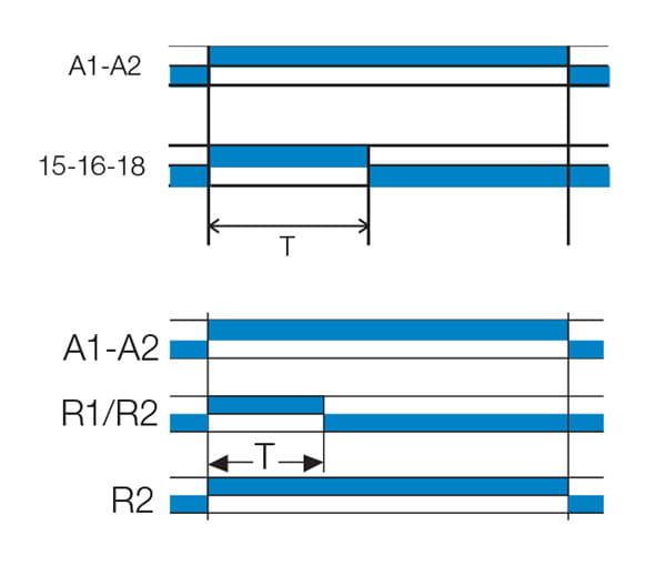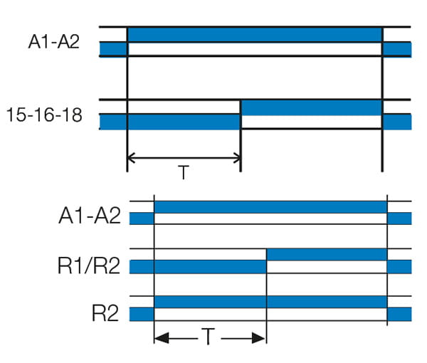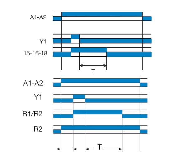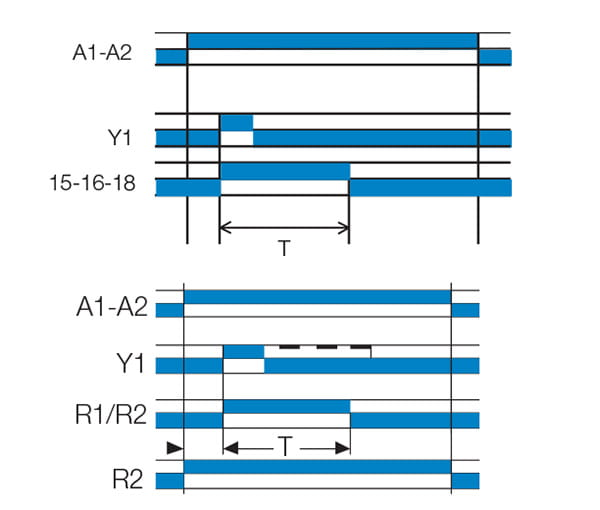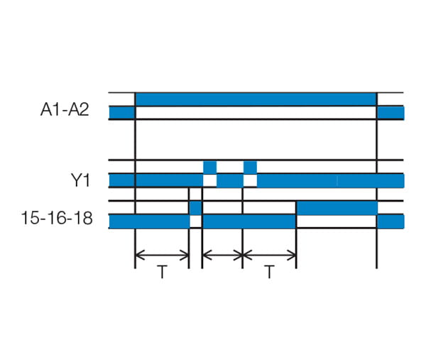 Driftsspenningen A1-A2 er tilkoblet. Når Y1 tilkobles, bytter releet fra 15-16 til 15-18. Tidtakingen starter først når Y1 frakobles. Releet går tilbake til 15-16 når innstilt tid er utløpt. Hvis Y1 tilkobles før tidtakingen er ferdig, nullstilles tiden. 2 tidskontakter eller 1 vekslende, hvorav 1 kan være momentan.