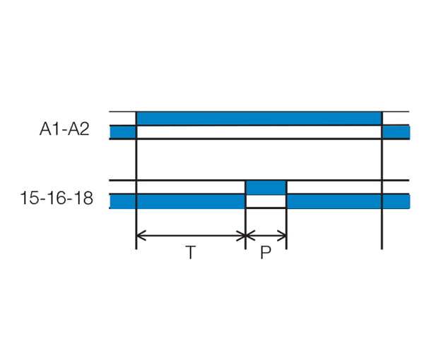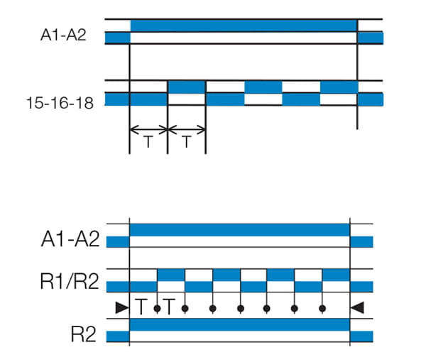 tidtakingen. Releet bytter umiddelbart fra 15-16 til 15-18 og går deretter tilbake til 15-16. Prosessen gjentas så lenge driftsspenningen A1-A2 er tilkoblet. Innstilt tid T er den samme for både pause og gangtid.