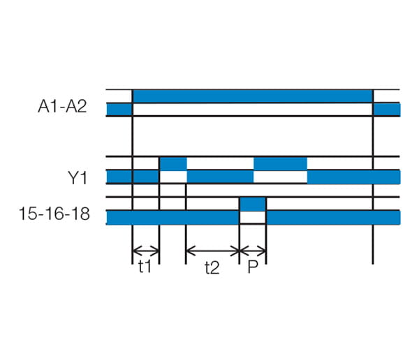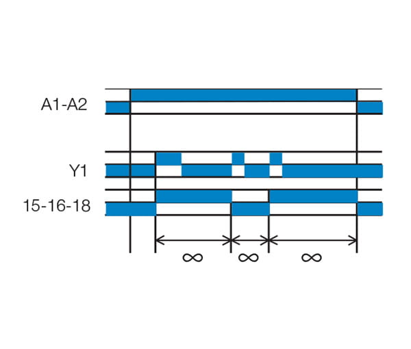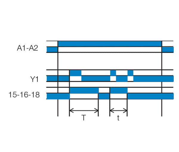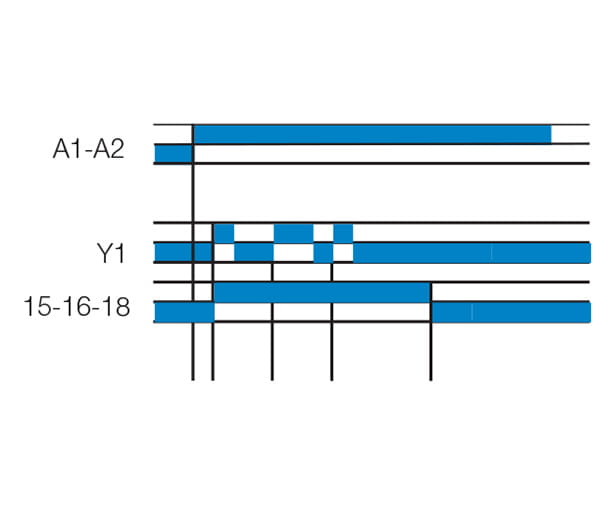 Y1 slås av og på vekselvis. Når den totale ”åpne” tiden når innstilt tid, går releet tilbake fra 15-18 til 15-16 (posisjonen 15-18 oppstod da driftsspenningen A1-A2 ble tilkoblet).