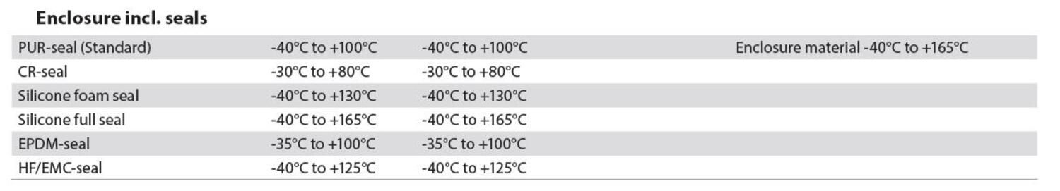 Denne serien med kapslinger blir levert med standard pakning, altså PUR. Det er mulig å bestille både silikon, EPDM,CR og HF pakning. Dette kan ikke byttes ut, da kapslingene blir produsert med støpt pakning fra fabrikken.