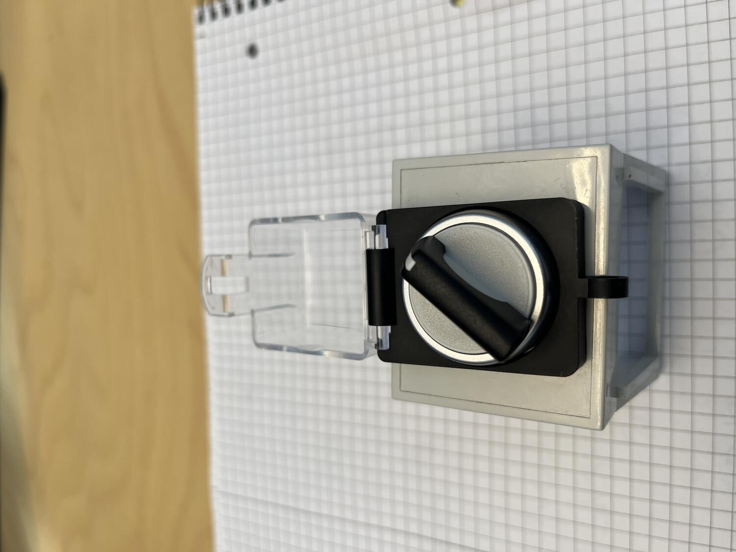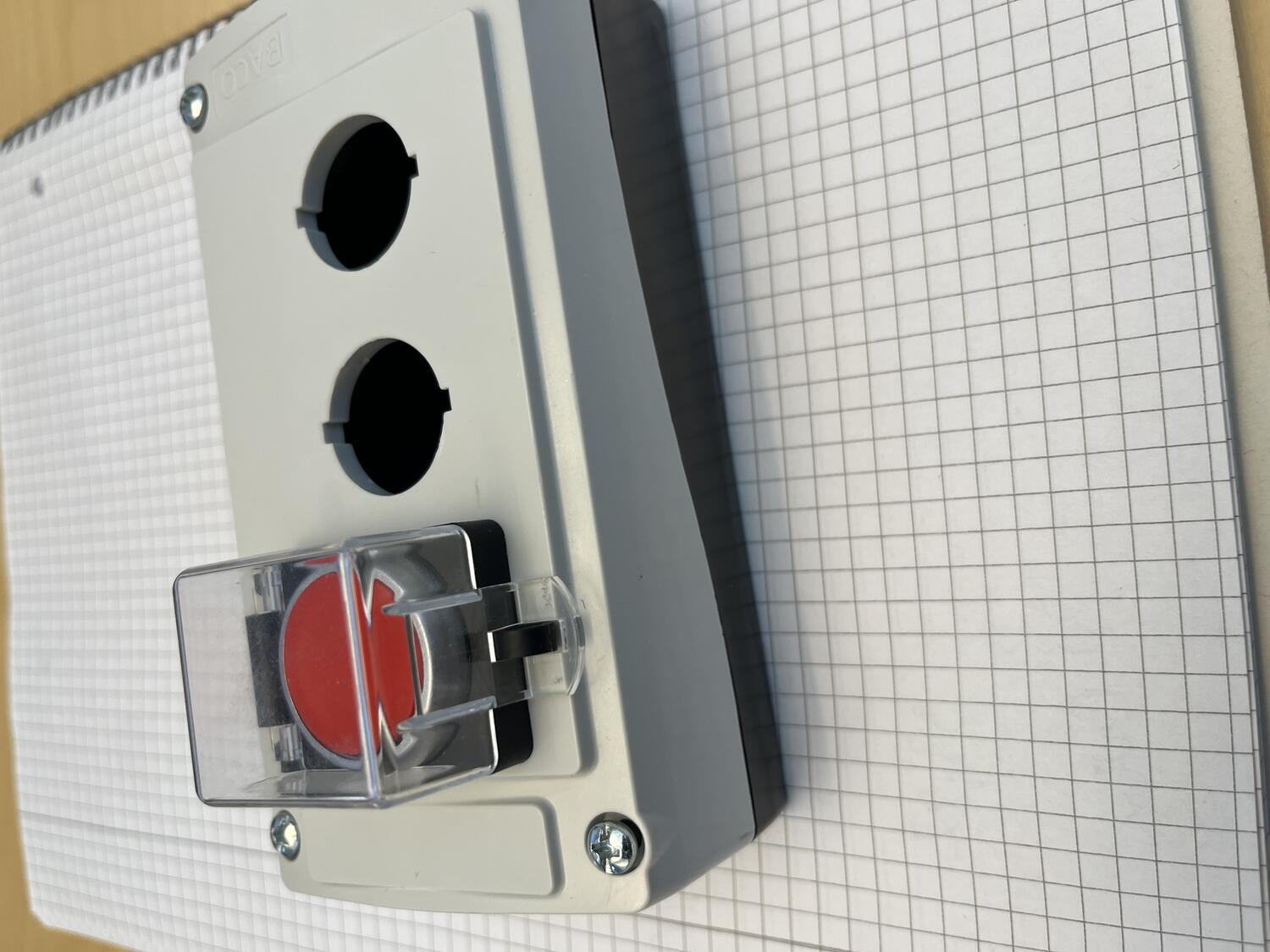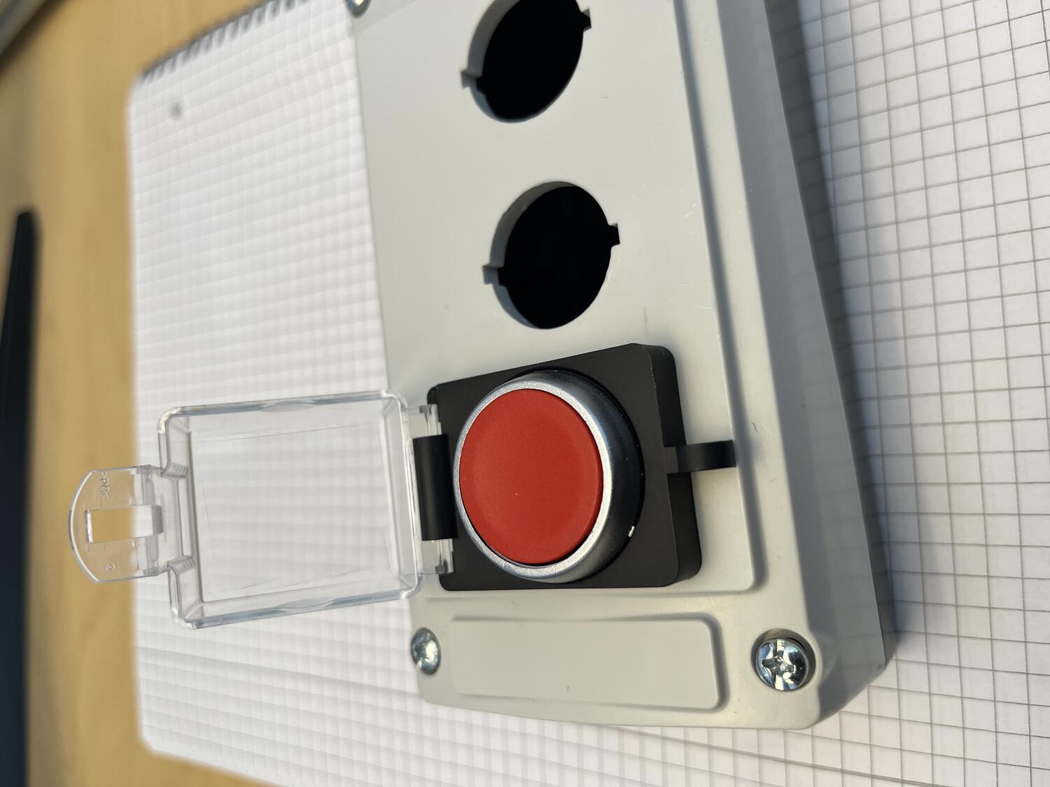 Denne kåpen er tatt frem for å forhindre utilsiktet aktivering og for å beskytte knappen. Man kan også låseog plombere lokket.